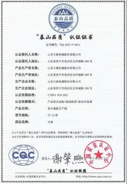 近日,山東天意機(jī)械股份有限公司榮獲“泰山品質(zhì)”認(rèn)證證書(shū),這是濟(jì)寧市企業(yè)繼山東如意毛紡服裝集團(tuán)股份有限公司、通亞汽車(chē)制造有限公司之后,再次獲得“泰山品質(zhì)”認(rèn)證證書(shū)。