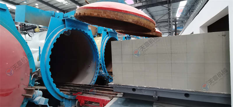 蒸壓養(yǎng)護(hù)是對加氣混凝土坯體進(jìn)行高壓蒸汽養(yǎng)護(hù),對加氣混凝土而言,只有經(jīng)過一定的溫度和足夠時間的養(yǎng)護(hù),坯體才能完成必要的物理化學(xué)變化,從而達(dá)到滿足建筑施工的強(qiáng)度需要。 蒸壓養(yǎng)護(hù)工序決定了加氣混凝土內(nèi)在性能的最后形成。 裝入蒸養(yǎng)釜: 養(yǎng)護(hù)車上坯體被運(yùn)至蒸養(yǎng)釜, 在釜中受到高壓蒸汽的養(yǎng)護(hù)