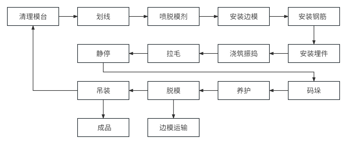 PC環(huán)形疊合板生產(chǎn)工藝主要由清理模臺、噴脫模劑、劃線、安裝邊模、安裝鋼筋、安裝埋件、澆筑振搗、拉毛、靜停、碼垛、養(yǎng)護(hù)、脫模、吊裝等工藝組成。